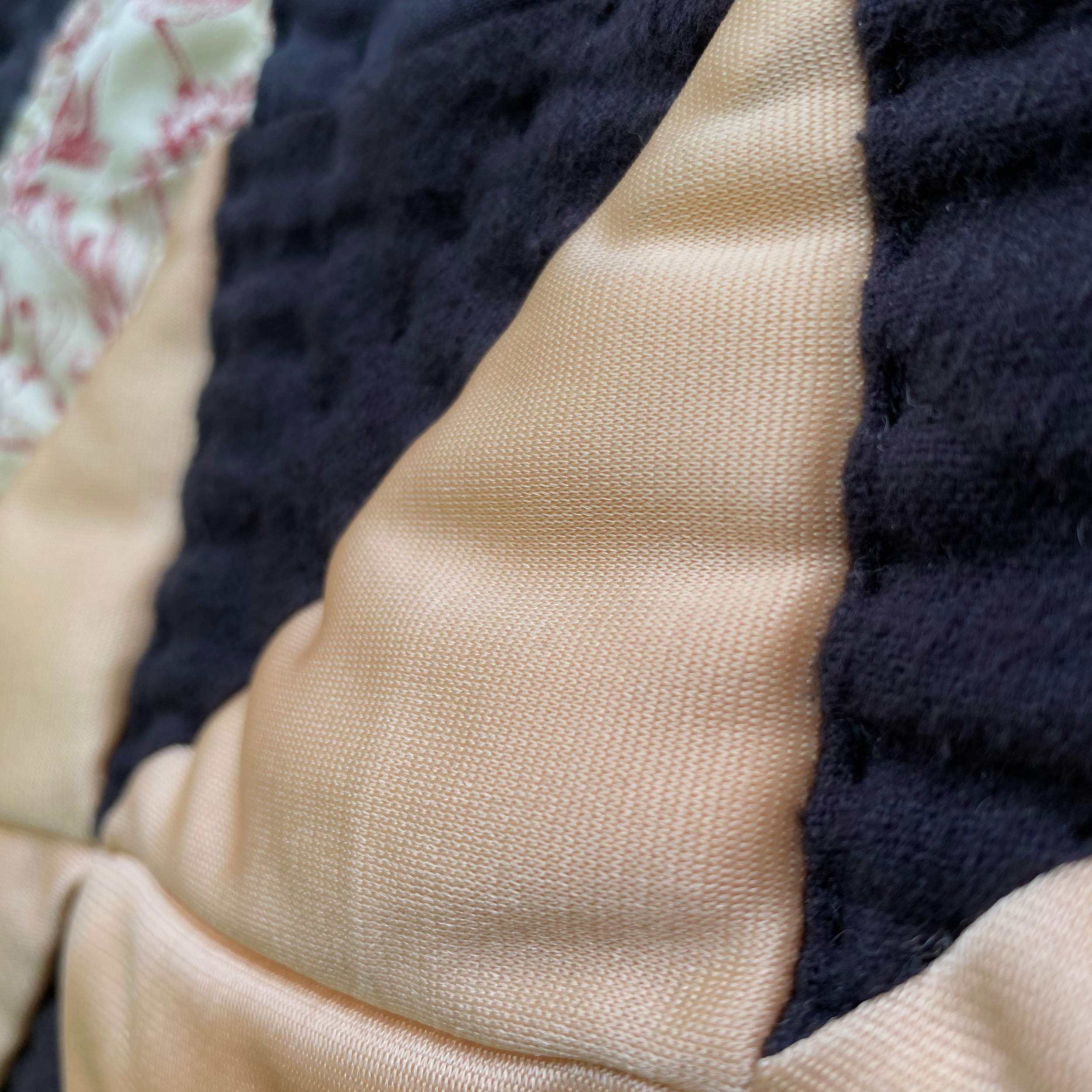 BACK Hawkmoth2025Reclaimed, dyed, and commercial fabrics, batting, thread, mounted on wood. 18 x 18 inches.